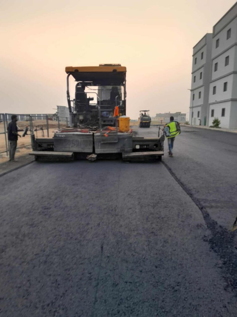 رصف الطبقة النهائية: صب الأسفلت وضغطه بطريقة تضمن التماسك والنعومة.